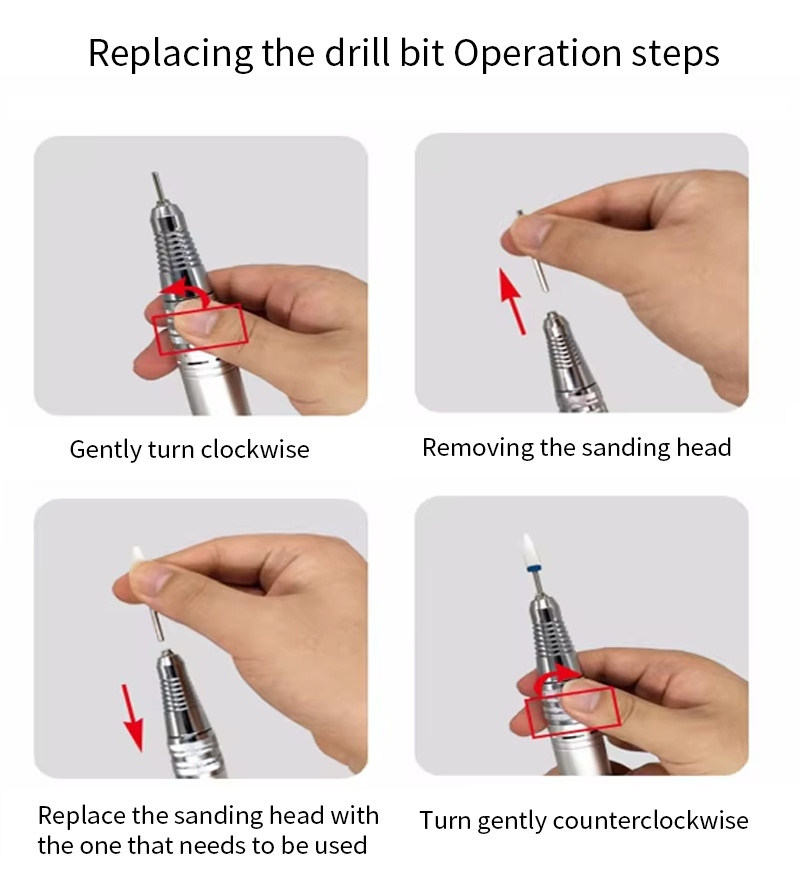 Kaedah operasi gerudi gantian gerudi kuku profesional berkelajuan tinggi 40,000 rpm ini, iaitu, palam dan cabut, mudah dan mudah, penggantian boleh digunakan selepas siap.