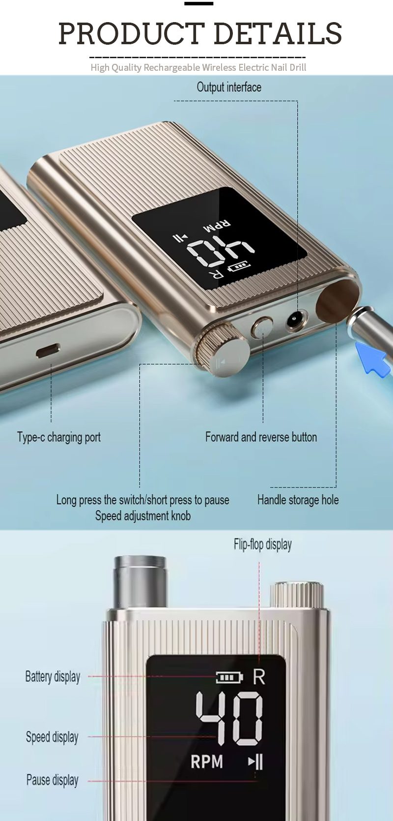 Reka bentuk paparan gerudi kuku profesional berkelajuan tinggi 40,000 rpm ini mempunyai suis hidup/mati dan putaran ke hadapan/balik untuk jumlah pengaktifan satu butang, soket pengecasan pantas di bahagian bawah, soket gerudi boleh diganti di bahagian atas, dan kelajuan boleh laras tiga kedudukan untuk memenuhi pelbagai keperluan.