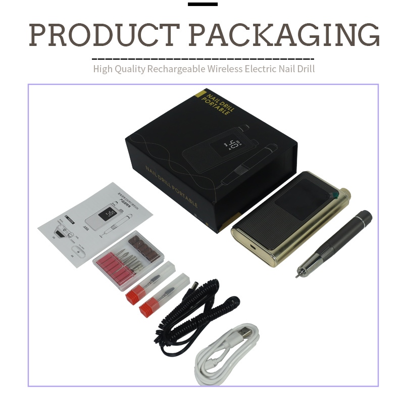 Kandungan pakej gerudi kuku profesional berkelajuan tinggi 40,000 rpm ini mempunyai produk pen pengamplasan, kabel pengecas USB, manual arahan produk dan kotak yang ringan dan mudah alih.