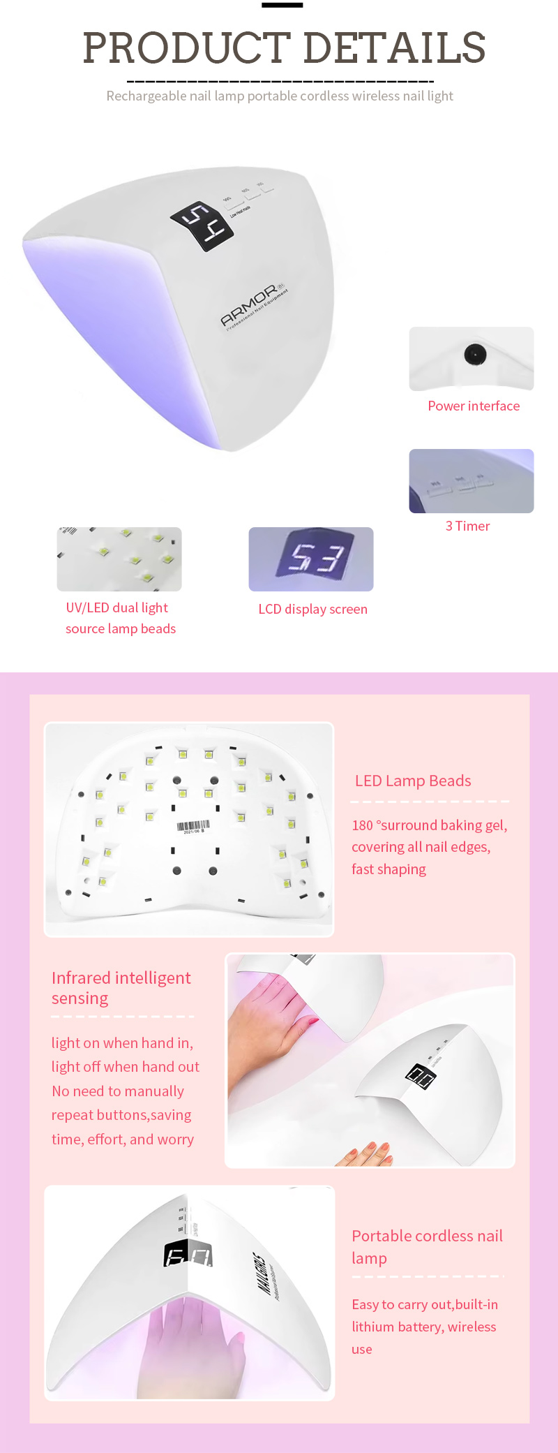 Dilengkapi dengan teknologi penderiaan pintar inframerah, cahaya mengaktifkan apabila tangan mendekati dan menyahaktifkan apabila tangan bergerak, menghapuskan keperluan untuk butang manual yang berulang kali menekan masa dan usaha. Pengeringan gam berkuasa tinggi tidak memerlukan tempoh menunggu yang panjang, menjimatkan masa dan usaha.