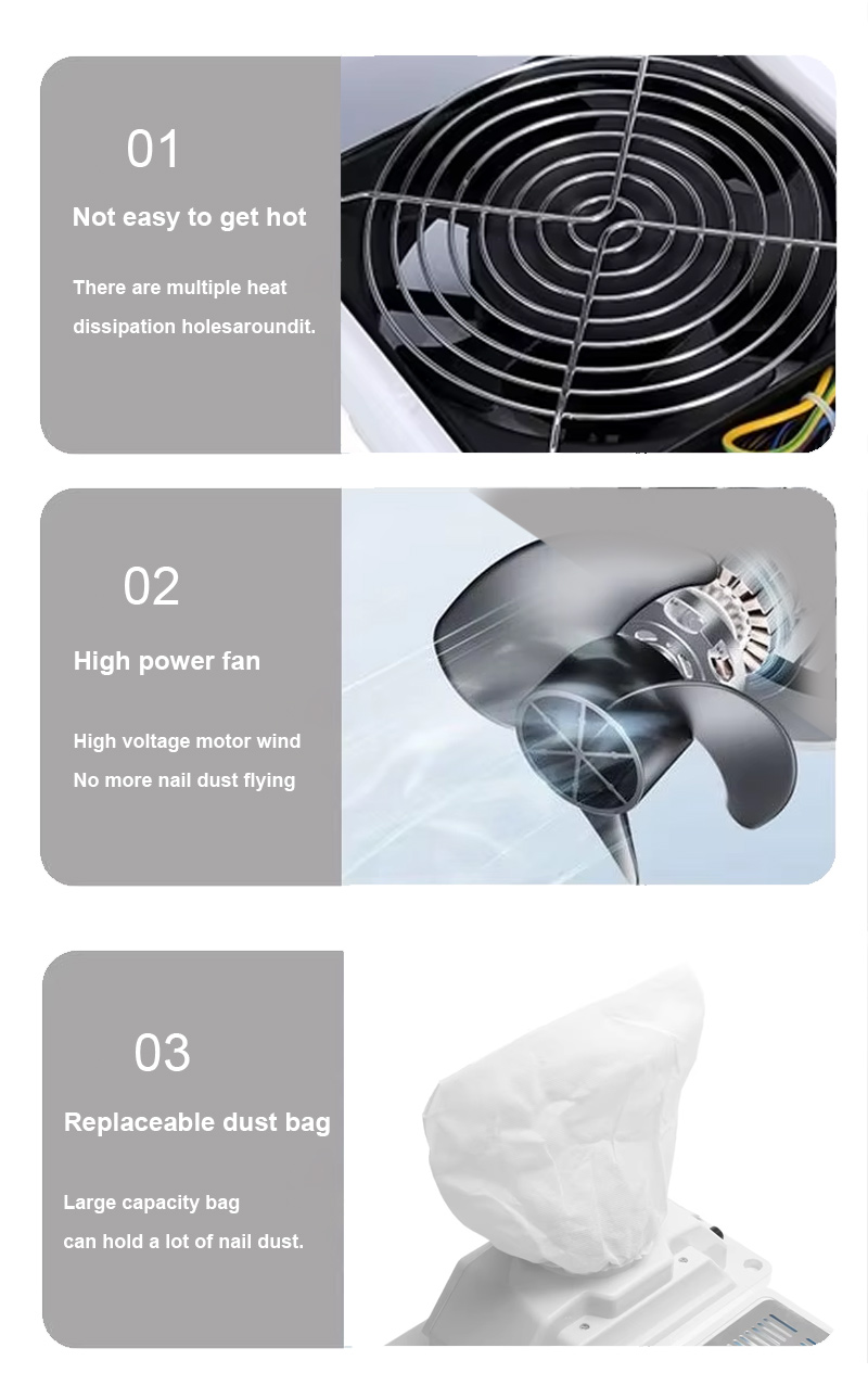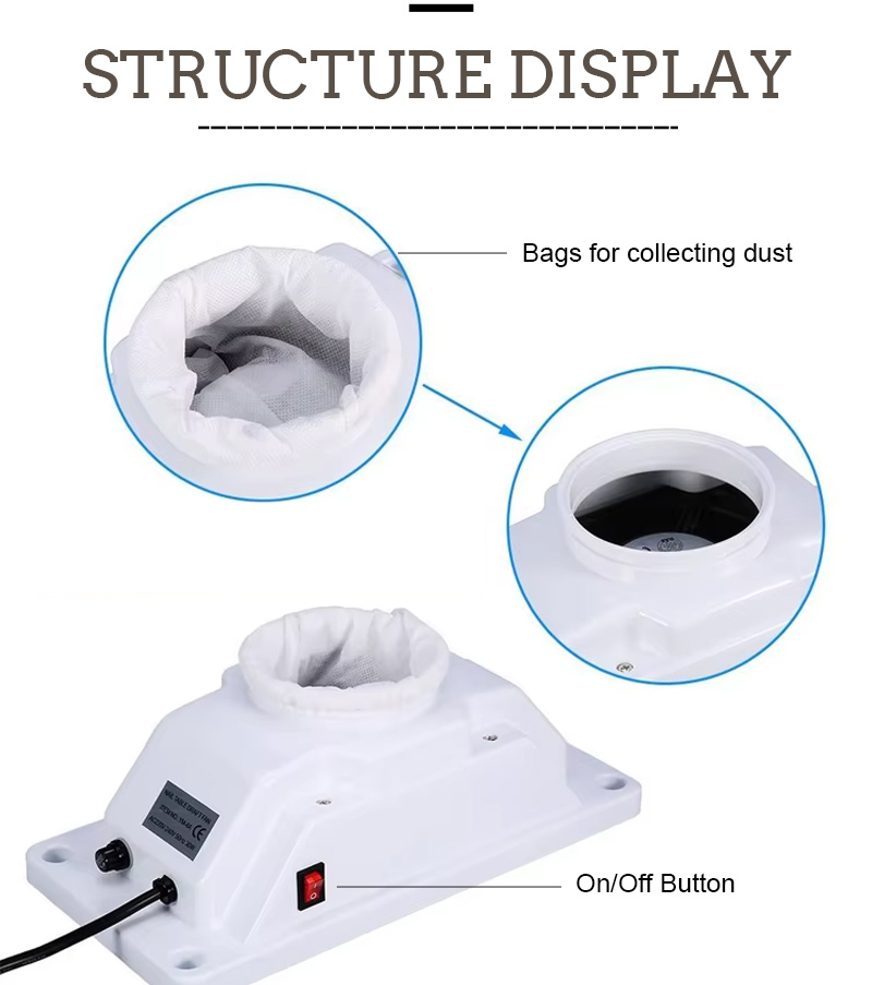 ya. ThePengumpul Habuk Kuku Terbenam Desktop direka khusus untuk tiada kebocoran habuk. Kuasa sedutan kuat 45W, digabungkan dengan pengedap yang berkesan di sekitar kawasan pengambilan, memastikan zarah habuk ditangkap pada sumber dan bukannya melarikan diri kembali ke ruang kerja. Semasa pemfailan akrilik yang berat, unit mengekalkan prestasi sedutan yang konsisten, memastikan permukaan meja bersih dan menghalang habuk daripada dibawa ke udara. Bagi juruteknik yang melakukan pelbagai perkhidmatan akrilik setiap hari, tangkapan habuk yang boleh dipercayai ini dengan ketara mengurangkan pendedahan habuk terkumpul dengan ketara.