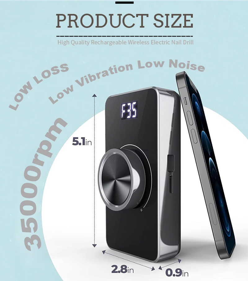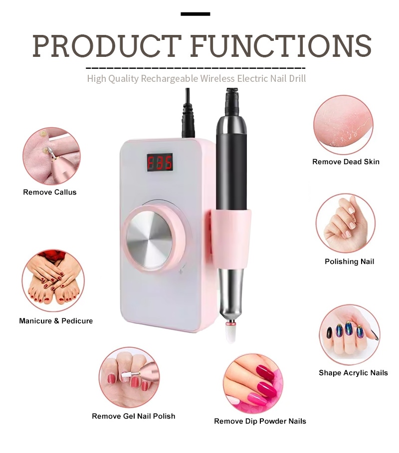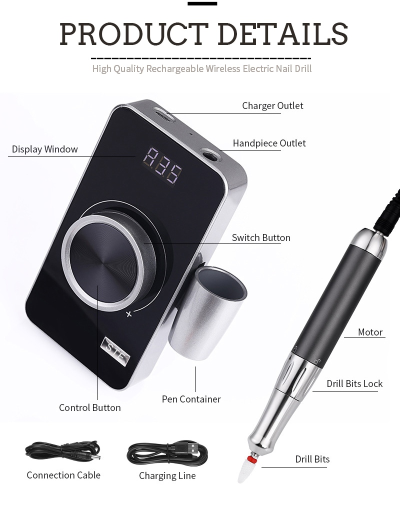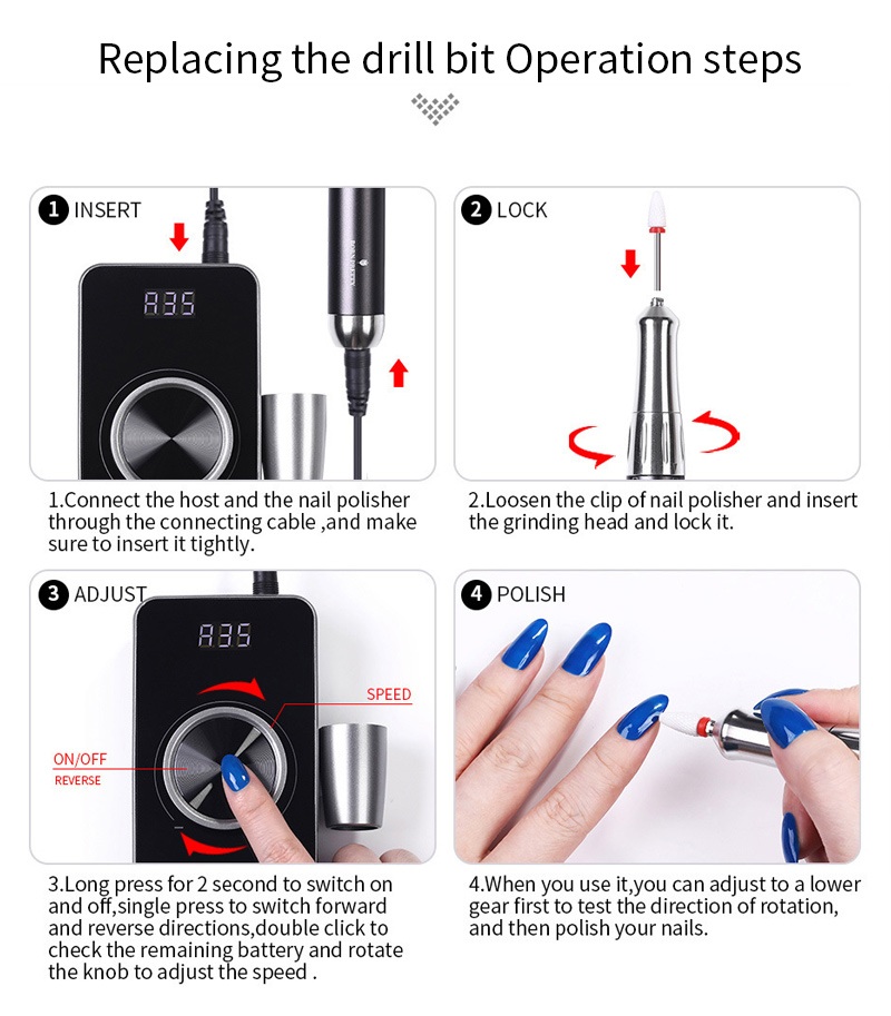 Kaedah operasi gerudi penggantian gerudi kuku elektrik pengelupasan 35,000 rpm ini, iaitu, palam dan cabut, penggantian yang mudah dan mudah, boleh digunakan selepas siap.