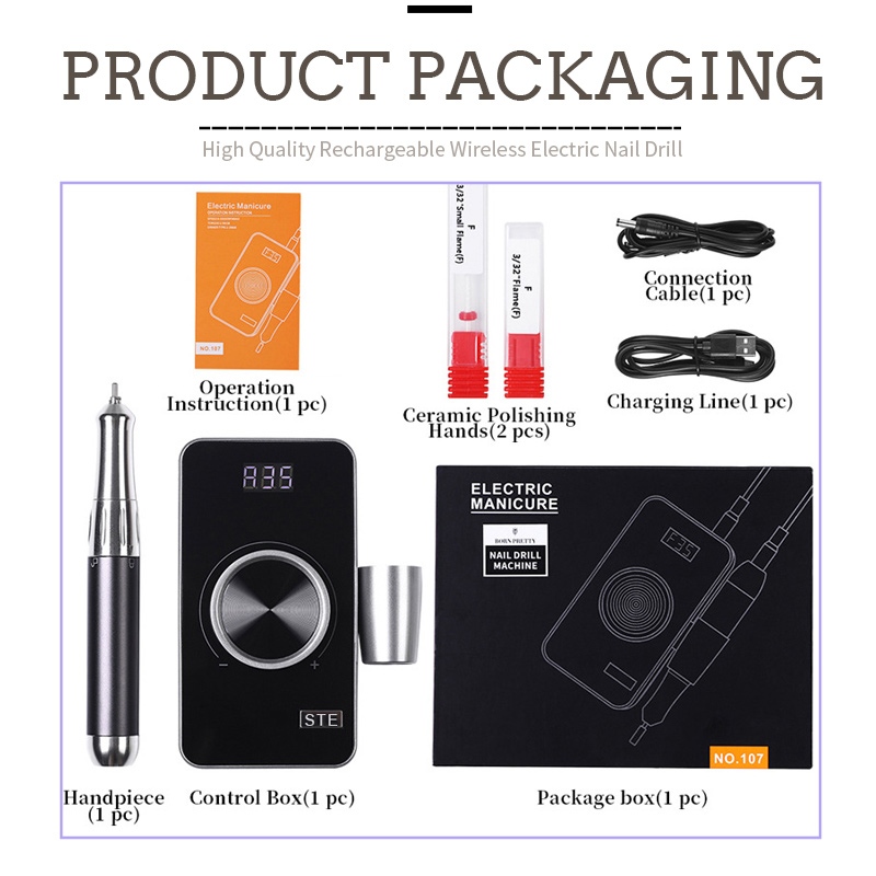 Kandungan pakej gerudi kuku elektrik pengelupasan 35,000 rpm ini mempunyai produk pen pengamplasan, kabel pengecas USB, manual arahan produk dan kotak yang ringan dan mudah alih.