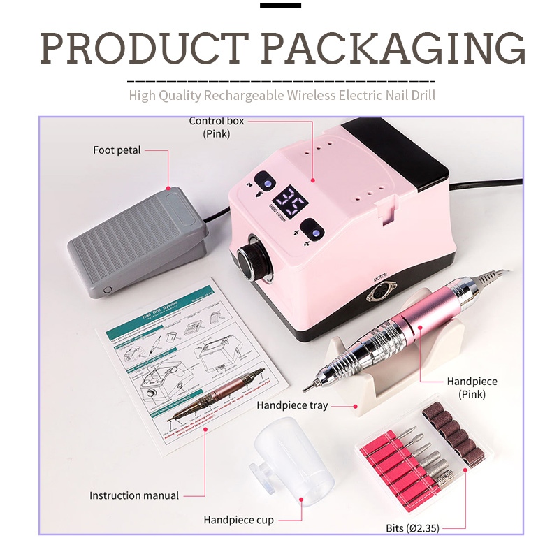 Kandungan pakej gerudi dan penggilap kuku pegang tangan ini mempunyai produk pen pengamplasan, kabel pengecas USB, manual arahan produk dan kotak yang ringan dan mudah alih.