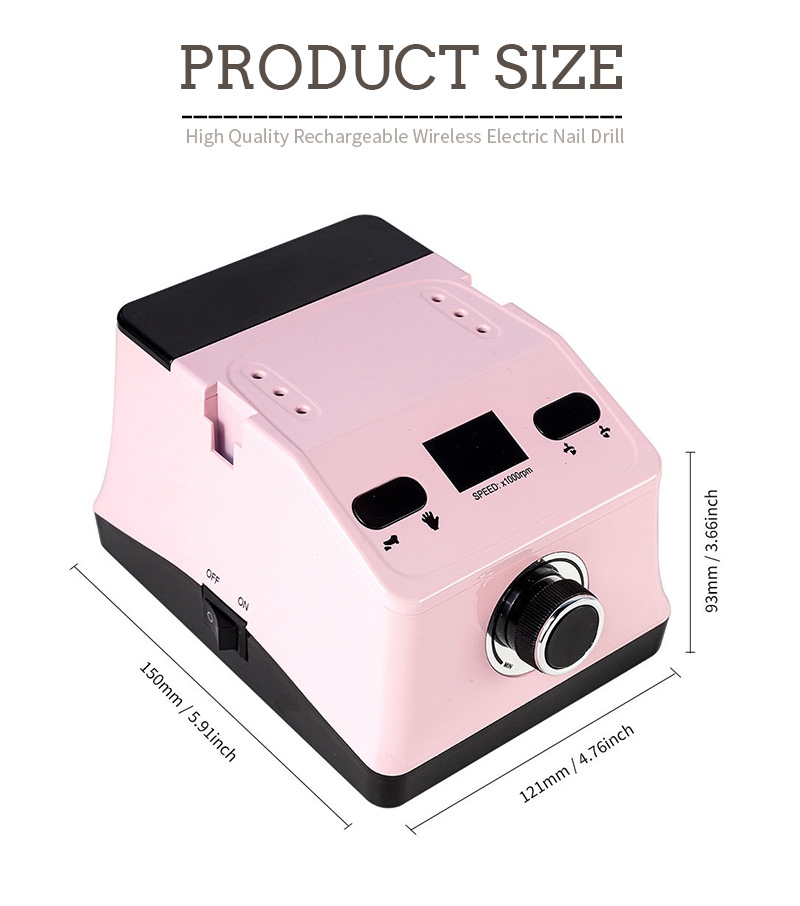 Reka bentuk paparan gerudi dan pengilat kuku pegang tangan ini mempunyai suis hidup/mati dan putaran ke hadapan/terbalik untuk jumlah pengaktifan satu butang, soket pengecasan pantas di bahagian bawah, soket gerudi boleh diganti di bahagian atas, dan kelajuan boleh laras tiga kedudukan untuk memenuhi pelbagai keperluan.
