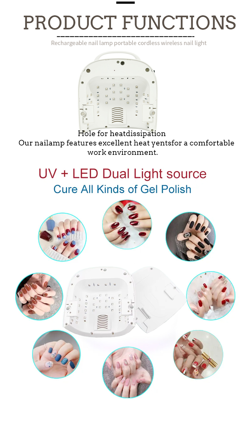 Produk ini memastikan pengeringan gam tanpa pengecutan. Sumber cahaya dwi memberikan pemanasan lembut untuk mencegah perubahan warna dan ketegangan mata, sesuai untuk kedua -dua tangan dan kaki, memberikan hasil pengeringan yang sangat cepat.