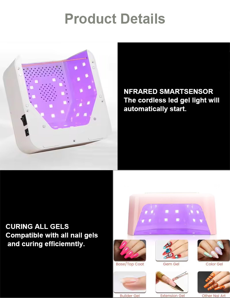 Lampu cepat kering pengilat kuku gel berkualiti tinggi ini memastikan pengeringan gam sekata tanpa pengecutan. Sumber cahaya dwinya memberikan pemanasan lembut untuk mengelakkan perubahan warna tangan dan ketegangan mata, sesuai untuk kedua-dua tangan dan kaki, memberikan hasil pengeringan yang sangat pantas.