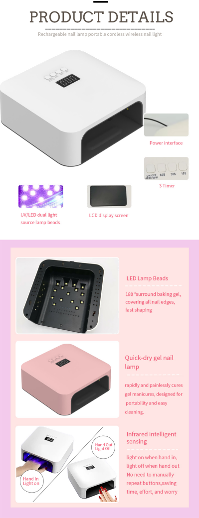 Lampu Pengeringan Kuku Pantas Berkualiti Tinggi memastikan pengeringan gam sekata tanpa pengecutan. Sumber cahaya dwinya memberikan pemanasan lembut untuk mengelakkan perubahan warna tangan dan ketegangan mata, sesuai untuk kedua-dua tangan dan kaki, memberikan hasil pengeringan yang sangat pantas.