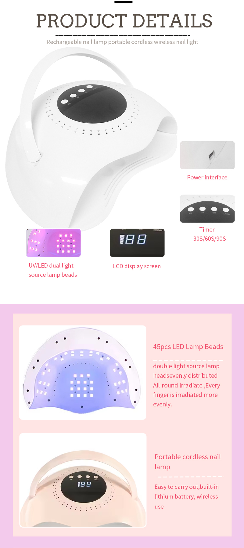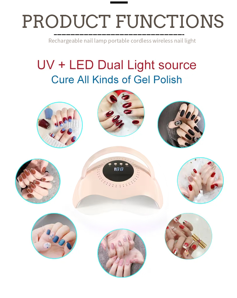 Produk ini memastikan pengeringan gam tanpa pengecutan. Sumber cahaya dwi memberikan pemanasan lembut untuk mencegah perubahan warna dan ketegangan mata, sesuai untuk kedua -dua tangan dan kaki, memberikan hasil pengeringan yang sangat cepat.
