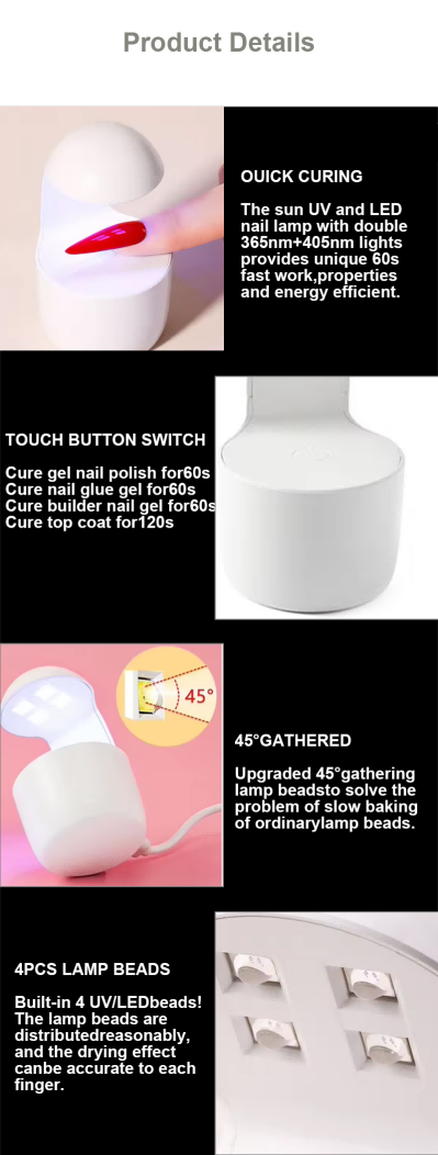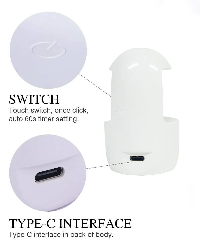Lampu Kuku Satu Jari Mini memastikan pengeringan gam sekata tanpa pengecutan. Sumber cahaya dwinya memberikan pemanasan lembut untuk mengelakkan perubahan warna tangan dan ketegangan mata, sesuai untuk kedua-dua tangan dan kaki, memberikan hasil pengeringan yang sangat pantas.