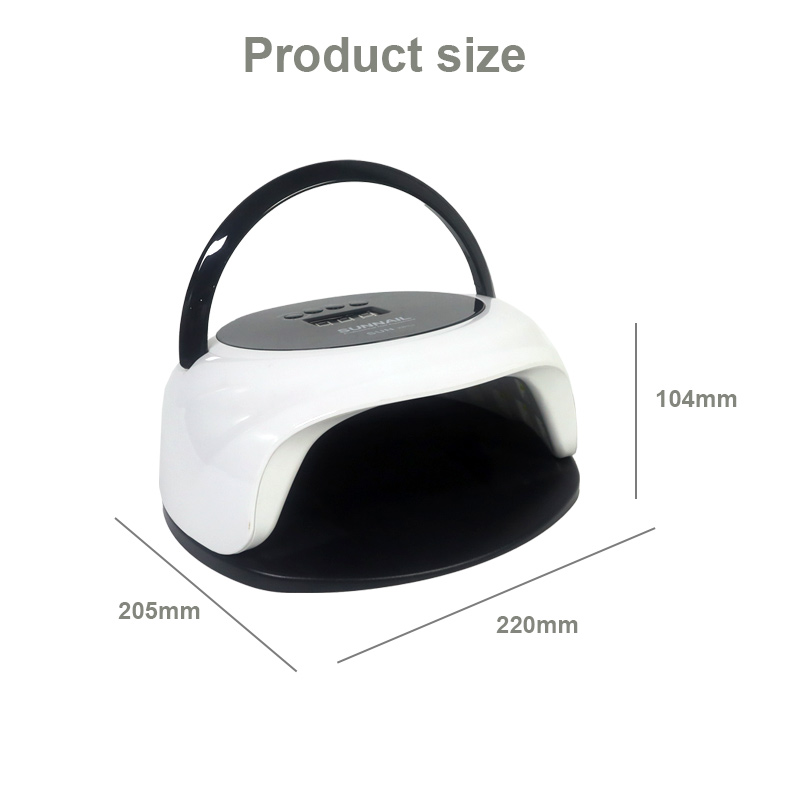 Dimensi lampu pengeringan kuku dengan fungsi sensor automatik ialah 205 mm panjang, 220 mm lebar dan 104mm tinggi, dengan kapasiti yang besar dan keupayaan untuk menggunakan kedua-dua tangan dan kaki, yang sangat mudah.