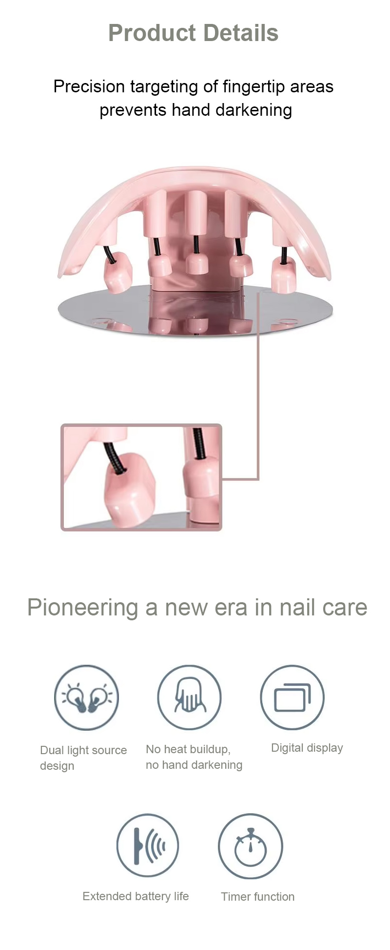 Produk ini memastikan pengeringan gam tanpa pengecutan. Sumber cahaya dwi memberikan pemanasan lembut untuk mencegah perubahan warna dan ketegangan mata, sesuai untuk kedua -dua tangan dan kaki, memberikan hasil pengeringan yang sangat cepat.
