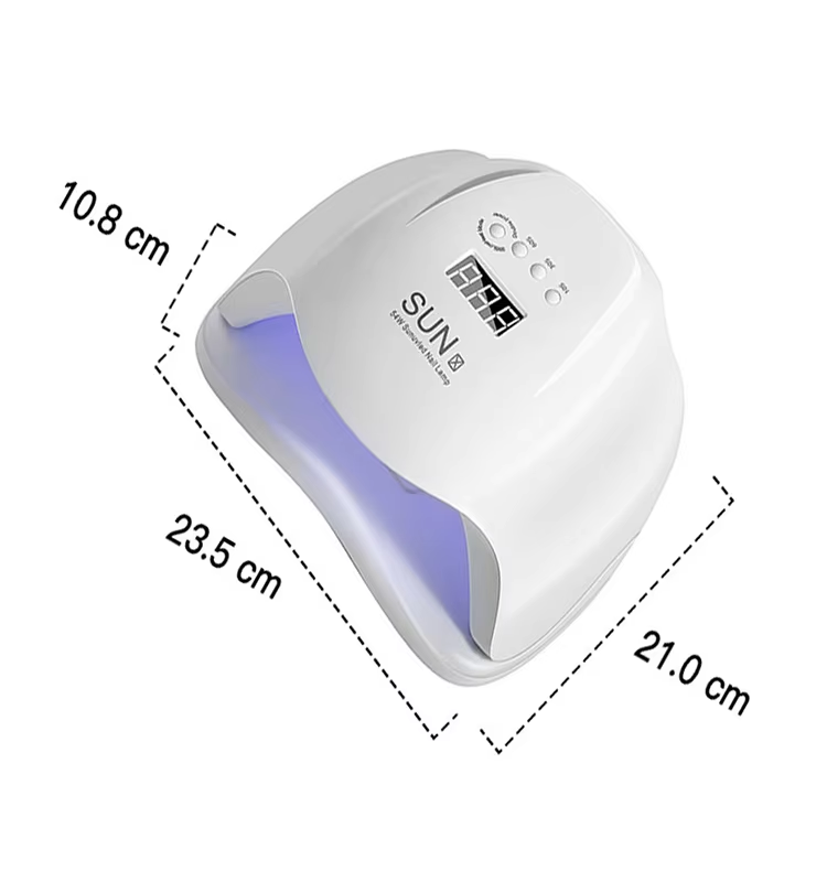 Lampu kuku gel cepat kering adalah 235 mm panjang, 210 mm lebar dan 108mm tinggi, dengan kapasiti besar dan keupayaan untuk menggunakan kedua-dua tangan dan kaki, yang sangat mudah.