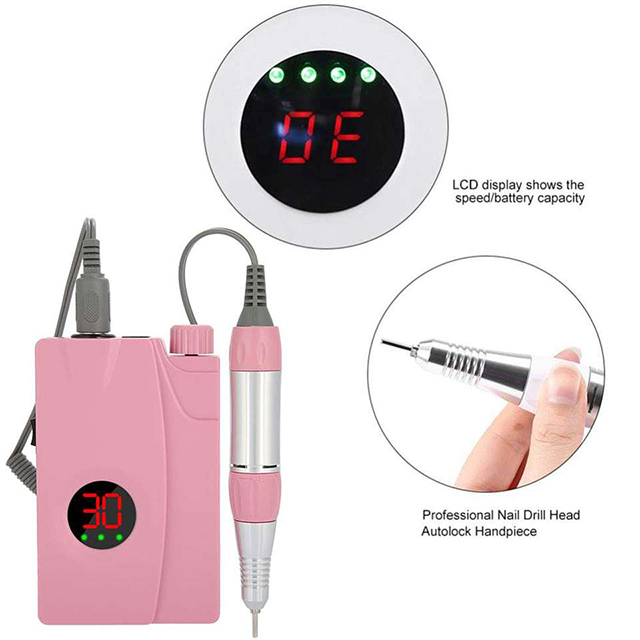 Butiran Produk Set Gerudi Kuku Boleh Dicas semula Merah Jambu Dengan Pemegang 25w 30000rpm