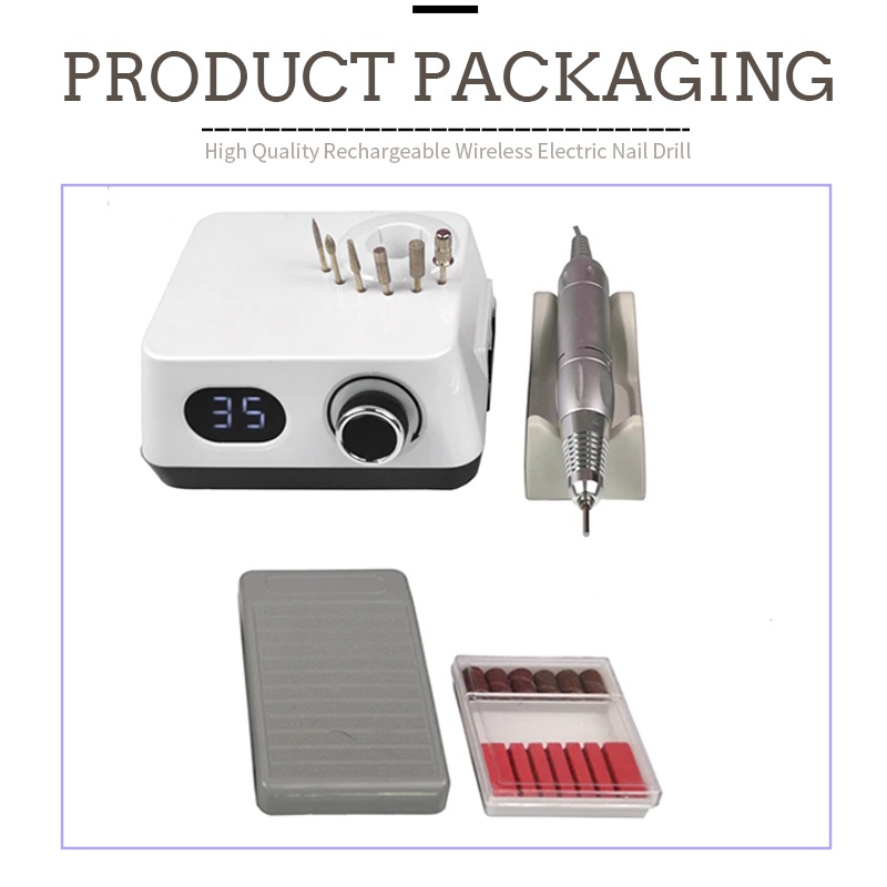 Kandungan gerudi kuku elektrik tanpa wayar dengan pakej 35,000 rpm ini mempunyai produk pen pengamplasan, kabel pengecas USB, manual arahan produk dan kotak yang ringan dan mudah alih.